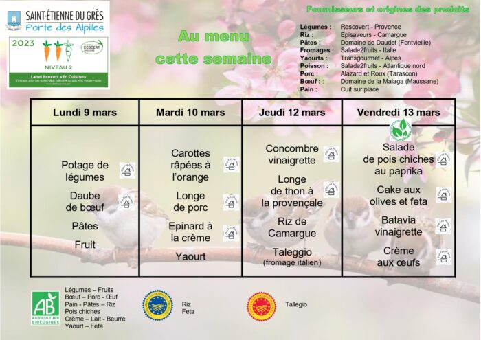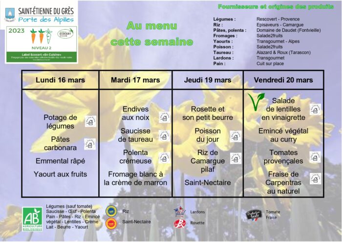Les menus sont donnés à titre indicatifs et sont susceptibles d'être modifiés en fonction des possibles ruptures d'approvisionnement.