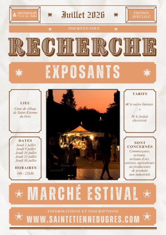 Mis en place durant l’été 2024, le marché artisanal nocturne rencontre depuis un très beau succès auprès du public et des exposants. Fort de cet engouement, cet événement convivial, qui anime les jeudis soirs à Saint-Étienne du Grès, sera renouvelé à l’été 2026.