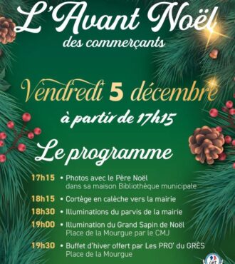 Puis, à partir de 19h30, « Les Pro’ du Grès » (l’association des commerçants et artisans du village) invitent tout le village pour un buffet convivial et gourmand en présence du Père Noël, place de la Mourgue.