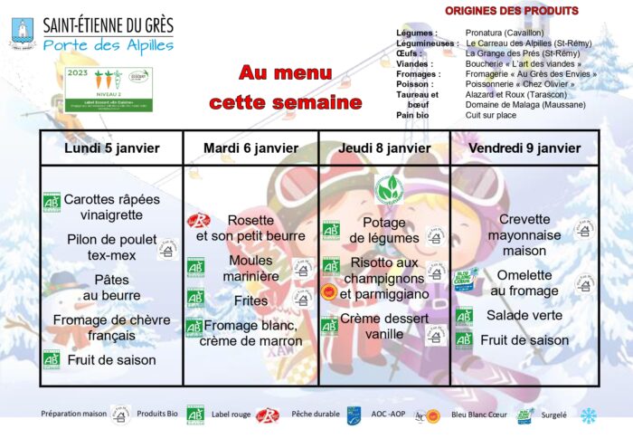 Les menus sont donnés à titre indicatifs et sont susceptibles d'être modifiés en fonction des possibles ruptures d'approvisionnement.
