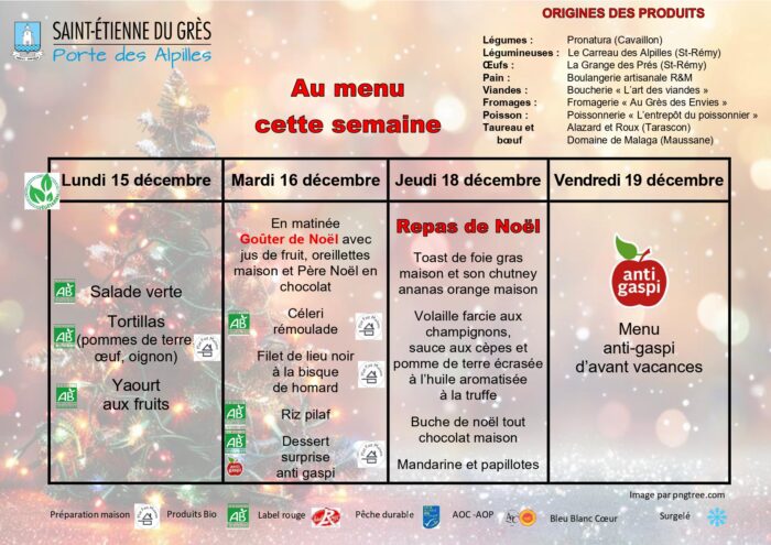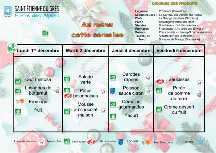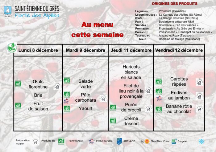 Les menus sont donnés à titre indicatifs et sont susceptibles d'être modifiés en fonction des possibles ruptures d'approvisionnement.