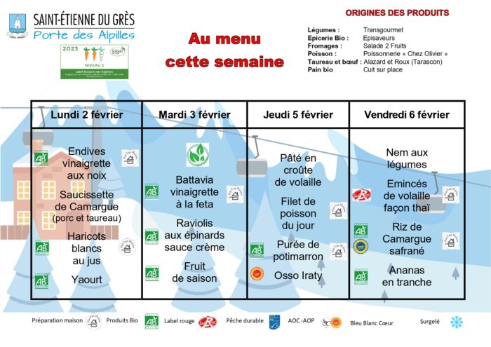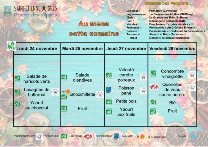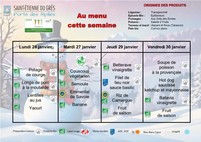 Les menus sont donnés à titre indicatifs et sont susceptibles d'être modifiés en fonction des possibles ruptures d'approvisionnement.